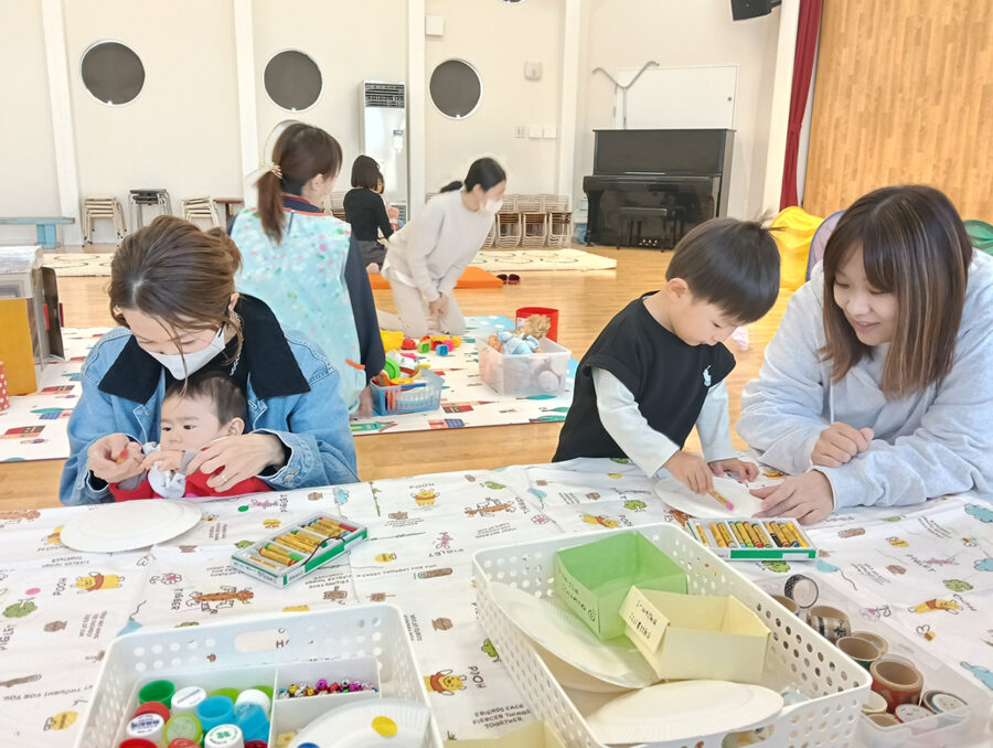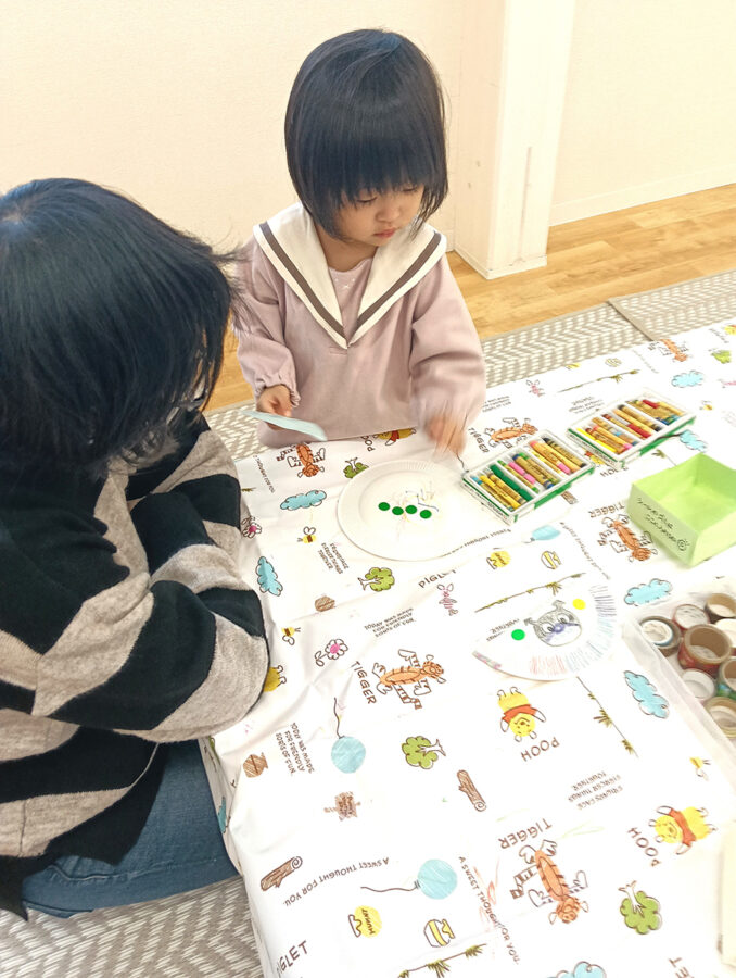 「作ってあそぼう!」のコーナーでは紙皿でタンバリンやカスタネットを作りましたよ。お絵描きやシールを貼って手作り楽器にデコレーションをしたお友だちもいました♪
