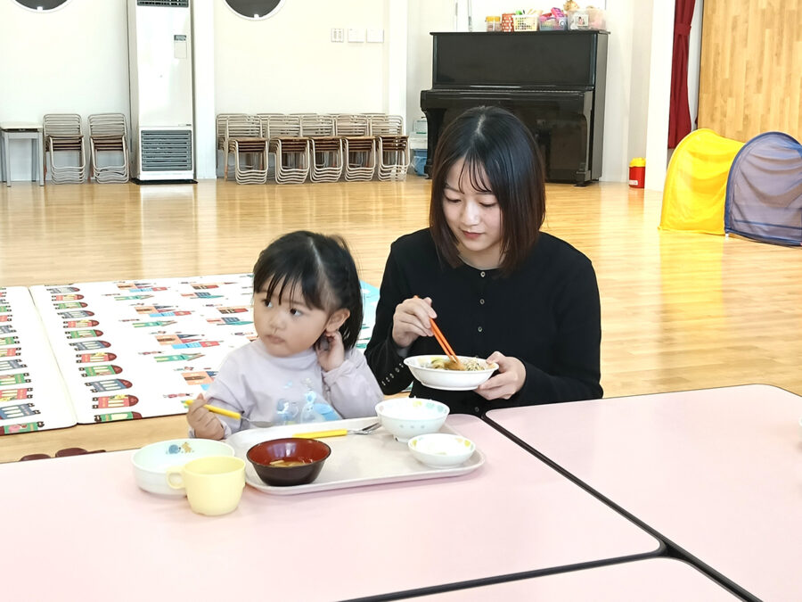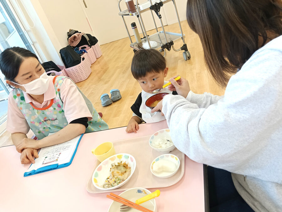 遊んだ後は、給食試食!この日のメニューは「ごはん、みそ汁、さばのピザ焼き、ごぼうのカミカミサラダ、フルーツ」でした。「給食、おいしいです!」というお声をいただいて嬉しかったです(^^)