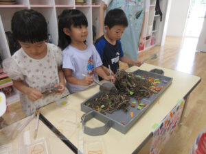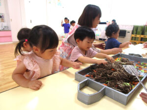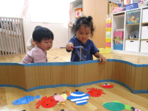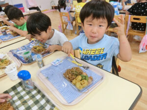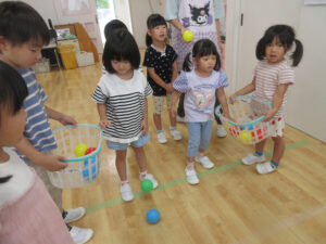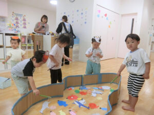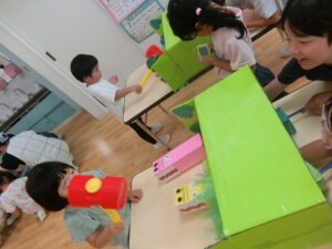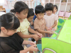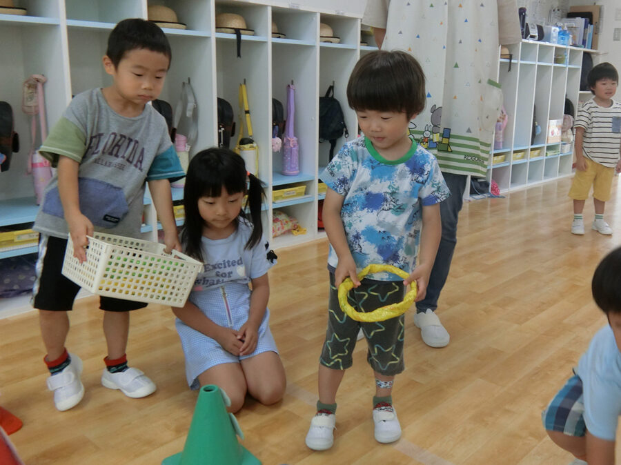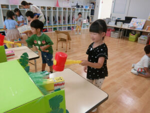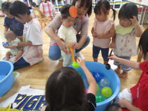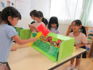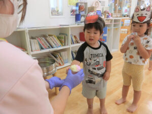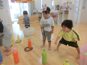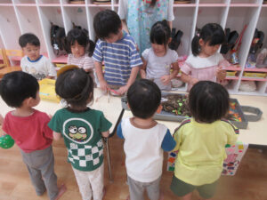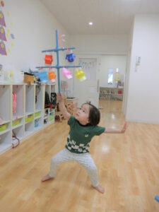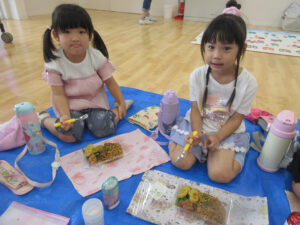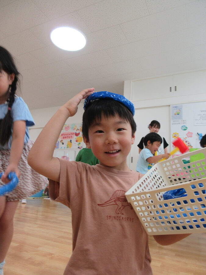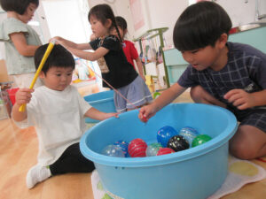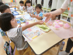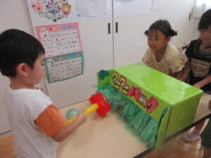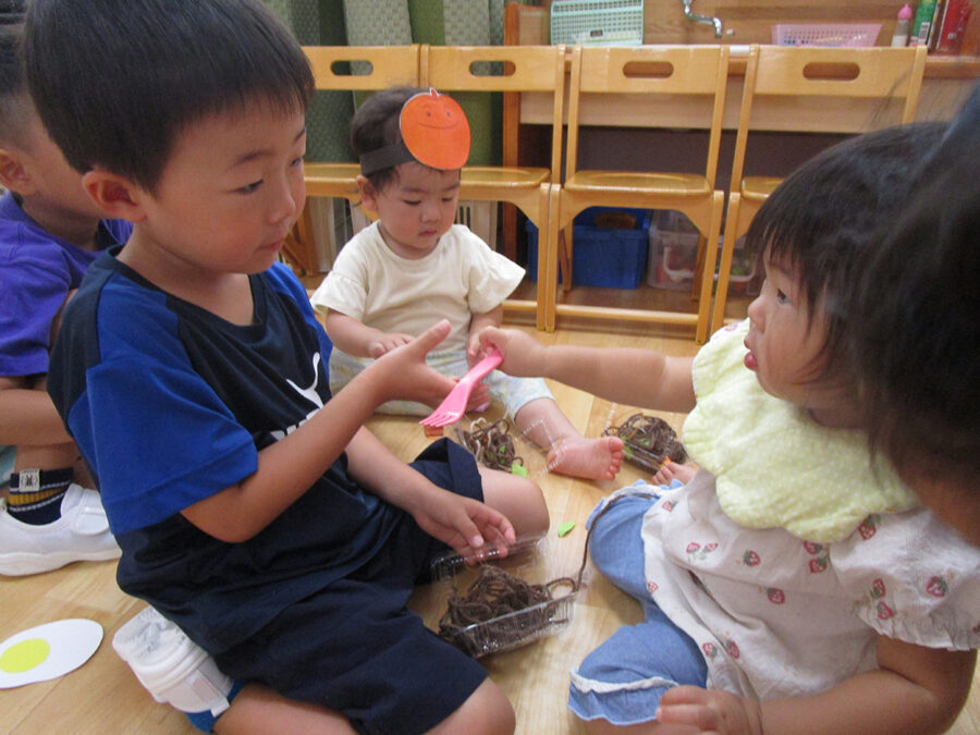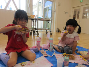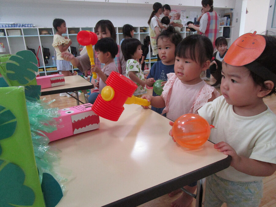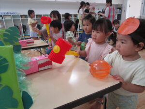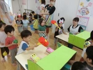 おまつりごっこ 8月 第二期のスタートは、おまつりごっこを楽しみました! ゆり組さんとちゅうりっぷ組さんが、遊びのコーナーを準備してくれ、ワニワニパニックやおばけの的当てなど、園のみんなが楽しめるように張り切ってお店屋さんに扮していました♪太鼓や手作り竿燈もあって、よりおまつりの雰囲気がでていましたよ。 給食でも、おまつりメニューということで、焼きそばやからあげなどに加え、なんとババヘラも登場!楽しい一日になりました(^^) 投稿ナビゲーション 七夕誕生会