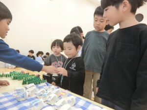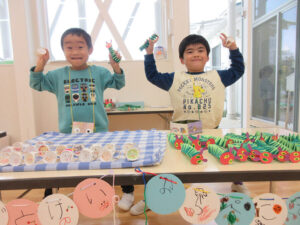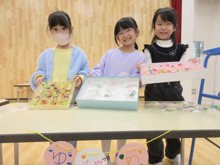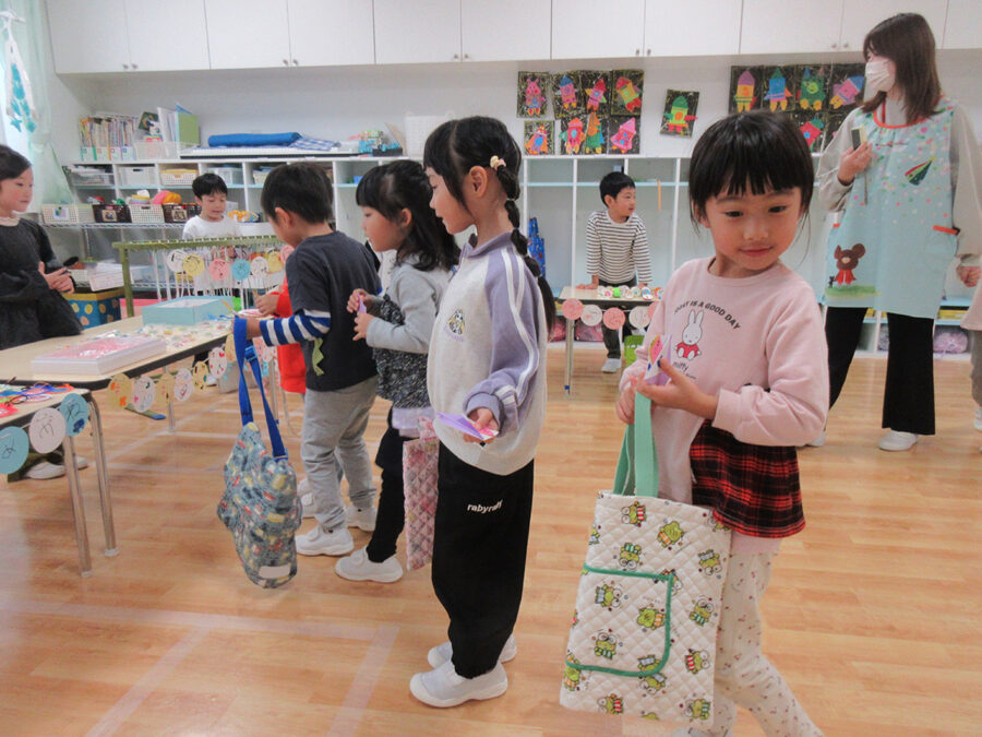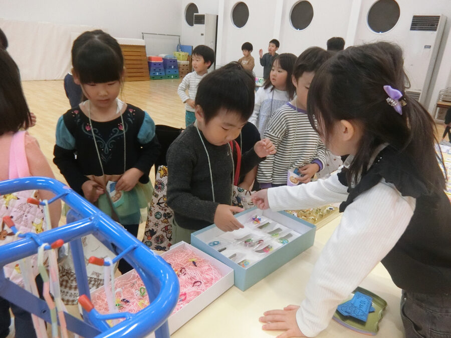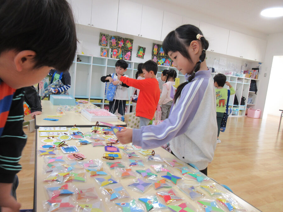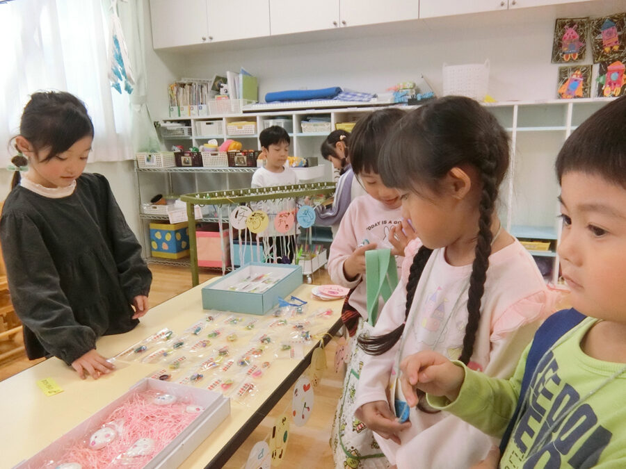 お店屋さんごっこ 10月 ゆり組の子どもたちが作った品物を、たくさんのお友だちが買いに来てくれました! 品物も買ってくれるお友だちのことを考えながら一つ一つ丁寧に作りました! 小さいお友だちはお兄さんお姉さんと一緒に買い物を楽しんだり、たんぽぽ組やちゅうりっぷ組はチケットと交換で品物を購入したり楽しみました! 投稿ナビゲーション ピアノで遊ぼうおにぎり給食・ピクニック