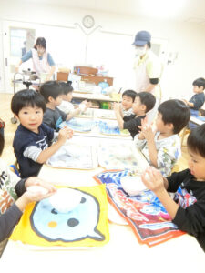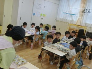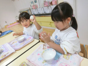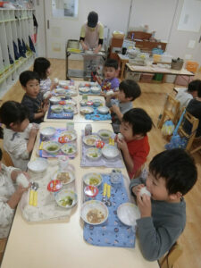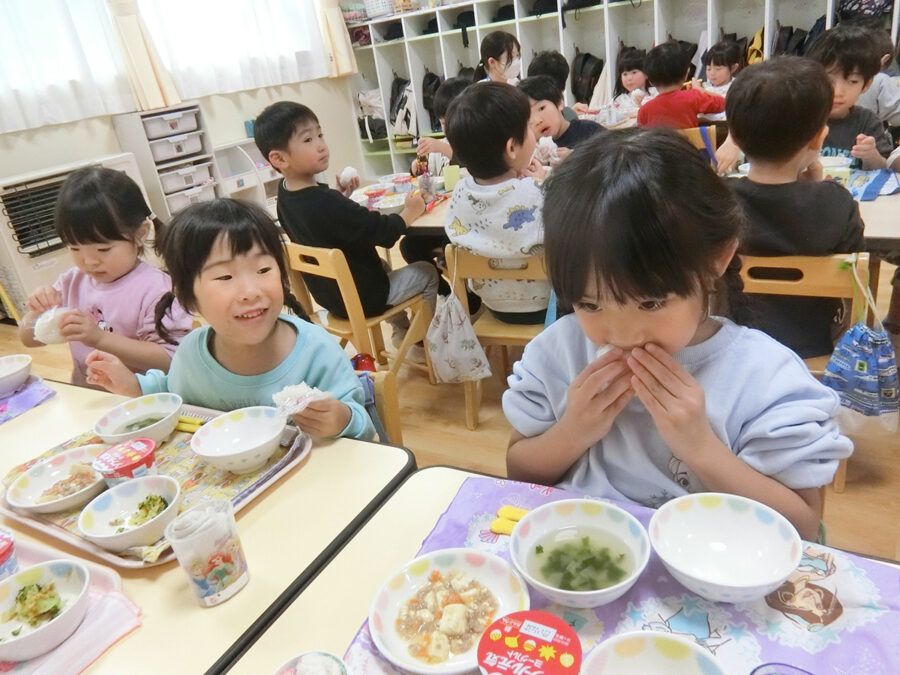 たんぽぽ組おにぎり給食 11月 ラップのお布団をご飯に優しくかけ、手をお山の形にしてギュッギュッギュッ。 丸いおにぎり、少し平たいおにぎり…など、それぞれの可愛らしいおにぎりが完成です! 自分で作ったおにぎりは格別だったようで、何個もおかわりして食べる子もいましたよ♪ 投稿ナビゲーション つぼみ組保育参観クッキング