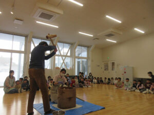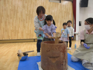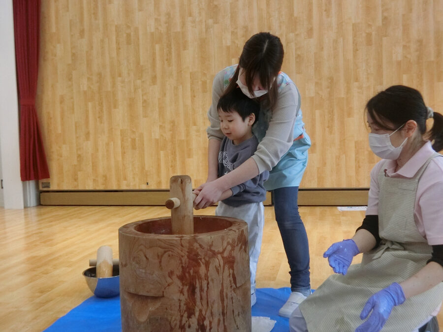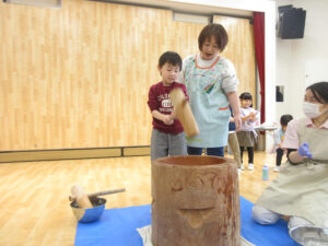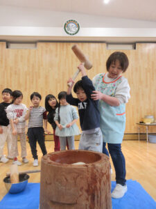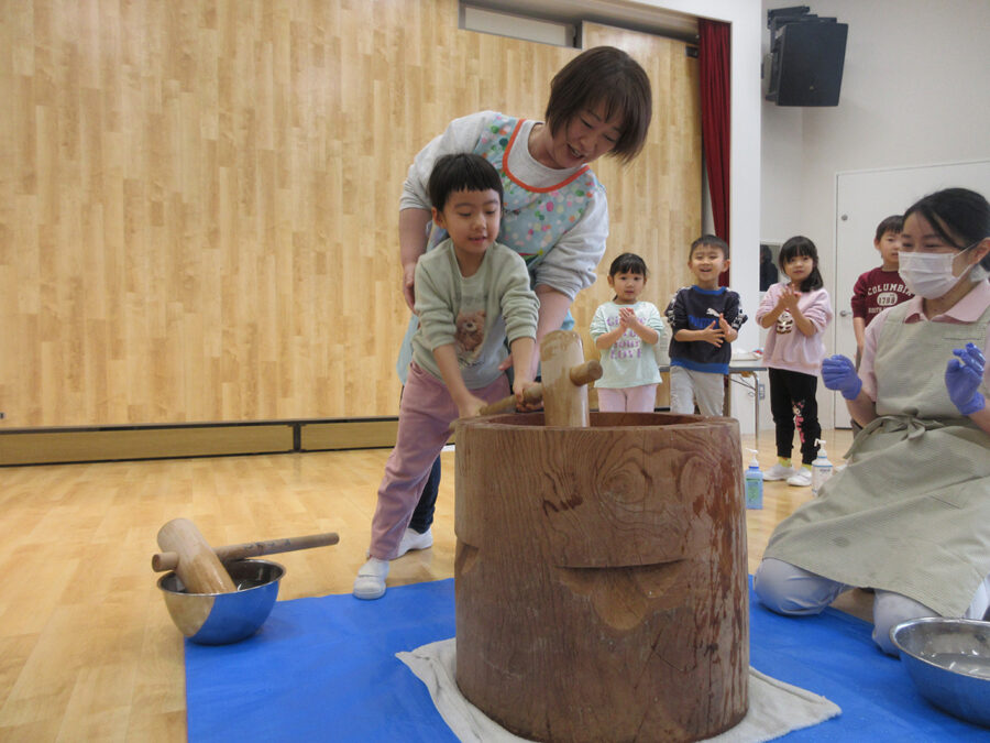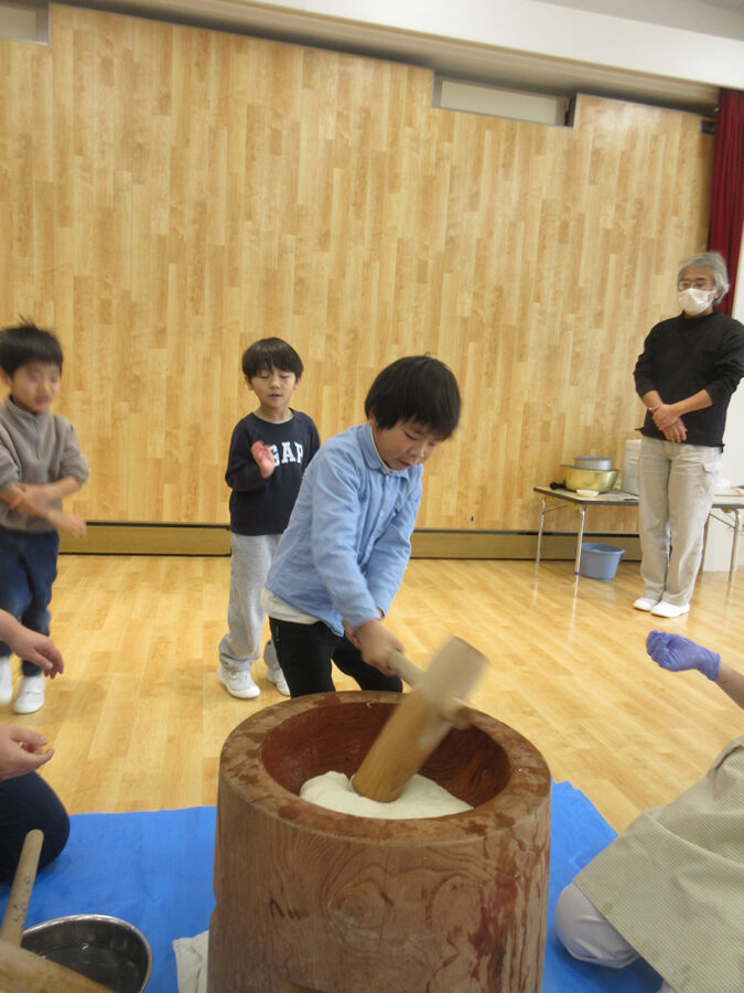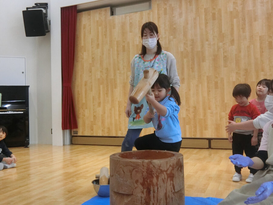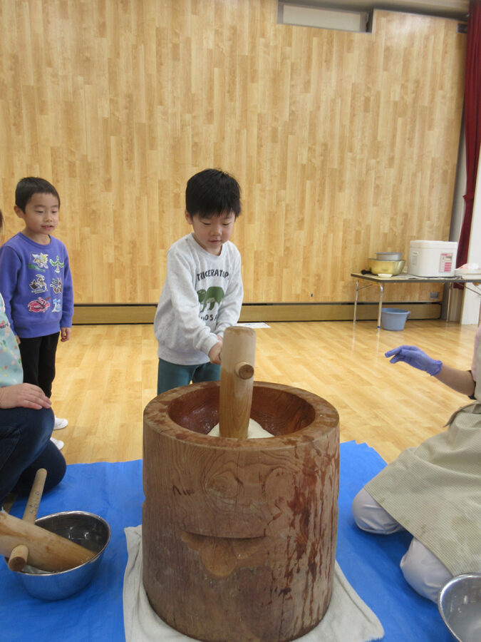 冬まつり 1月 ♪ぺったんぺったんぺったんこ♪ 本物の杵はちょっぴり重かったけど、力いっぱい頑張ったよ! やわらかいお餅に、きな粉とあんこを付けて食べたら、 ほっぺたが落っこちそうなくらい美味しかったです! みんなで、お手玉、紙鉄砲、けん玉など伝承あそびも楽しんで 素敵な一日となりました 投稿ナビゲーション 学びタイム誕生会